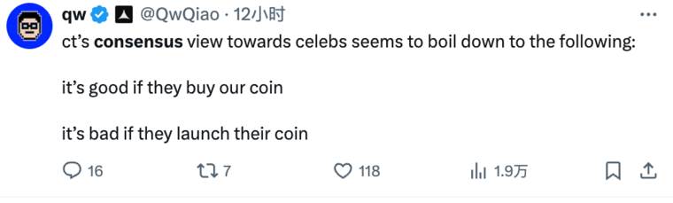 在这样的登山竞赛中,WangQiao 也指出了 Meme 炒作中的另一个共识:名人买了某个币,是个好事;名人发了某个币,此为凶兆。
