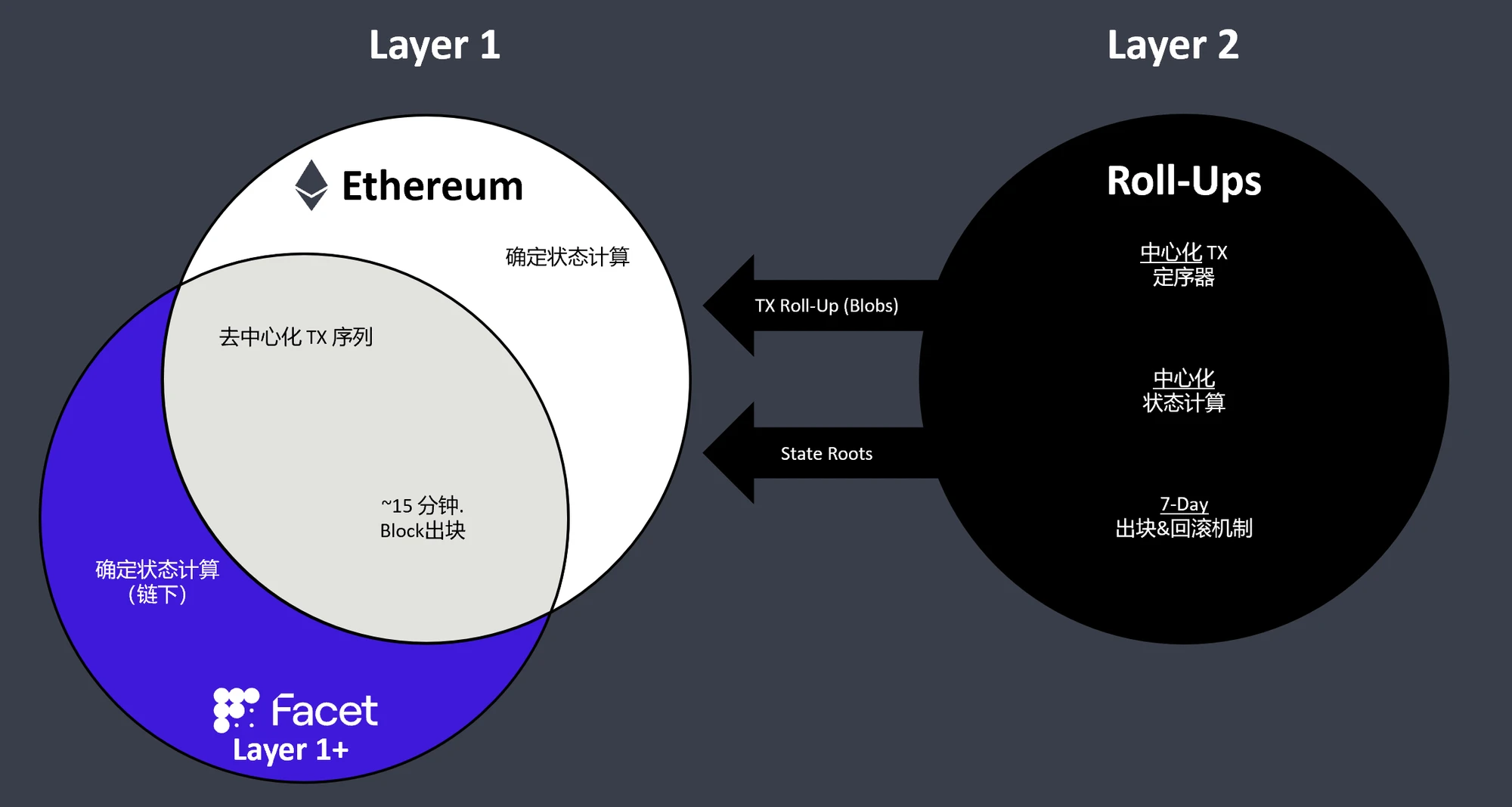而 Facet 实际上已经成为主网的L1+扩容方案,其实质就是将以太坊主网作为一个承诺的锚定层,根据账户模型进行链下客户端验证(开源多节点),基于主权的 Rollup 与L2的对比如下表:
