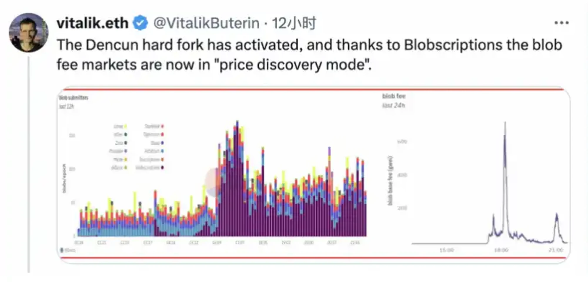 2024/03/28 ,以太坊创始人 Vitalik 发推感谢 Blobscriptions(ESIP-8) 成功激活坎昆升级后的 Blob 价格发现机制