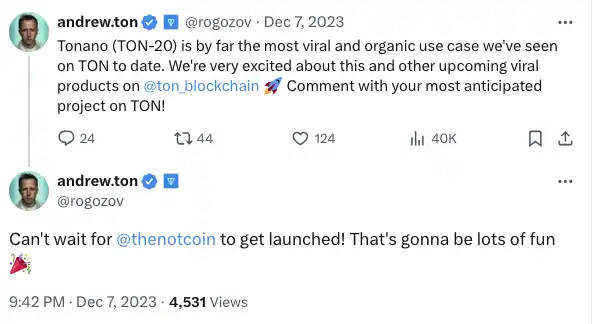另一方面,从今年开始 Solana 带来的 meme 格局,使得 meme 在公链上具备一定的生态位,而 Ton 上面目前还没有 Meme 生态位,这也让 NOT 在 TON 上有了 meme 的格局。正如 ACcapital founding 合伙人 @TeddyAC01 所说,Notcoin 为 Ton 带来流量,Ton 把运营资源向 Notcoin 倾斜。