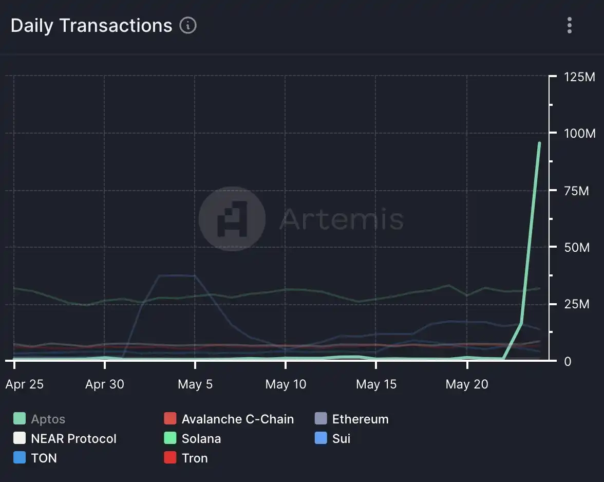 Notcoin 本质上可以说是一个通过「点击挖矿」的游戏,而该赛道目前仍处于小众阶段。但 5 月 26 日,根据链上分析机构 Artemis 的数据,Aptos 也因「点击挖矿」游戏 Tapos 造就了 9560 万笔的单日交易量,刷新了 L1 公链单日交易量的历史纪录。