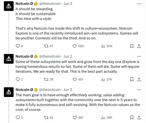 Notcoin 表示,其中一些子系统将从第一天起就开始工作和发展(到目前为止,探索已经取得了巨大的成果)。主要目标是在未来 4 至 5 年内与社区共同构建足够有效的工作、增值子系统,使其完全自主和自我发展。当然,以 Notcoin 价值为核心。