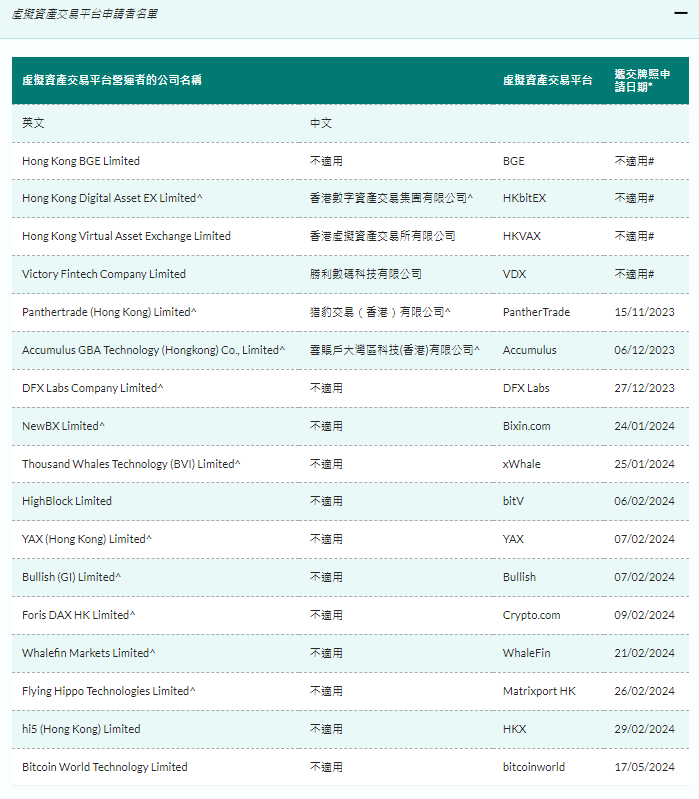 值得注意的是,目前尚有 HKbitEX、PantherTrade、Accumulus、DFX Labs、Bixin.com、xWhale、YAX、Bullish、Crypto.com、WhaleFin 和 Matrixport HK 这 11 家交易所被「当做获发牌」,简单来说就是待定名单。