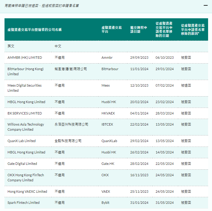 另一方面,未能符合要求而被视为「不当作获发牌」的平台,则必须在 3 个月以内结束所有业务。此前提交申请的 OKX、火币、Bybit 等交易所,目前其牌照申请已经撤回,全球主流的币安、Coinbase..等也未提交申请。