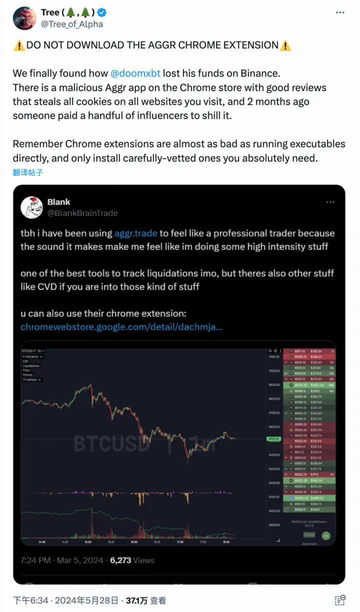 一𫔭始这个事件没有引起太大关注,但在 2024 年 5 月 28 日,推特使用者 @Tree_of_Alpha 分析发现受害者 @doomxbt 疑似安装了一个 Chrome 商店中有很多好评的恶意 Aggr 扩展套件,它可以窃取使用者访问的网站上的所有 cookies,并且 2 个月前有人付钱给一些有影响力的人来推广它。