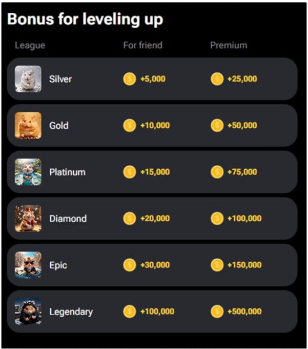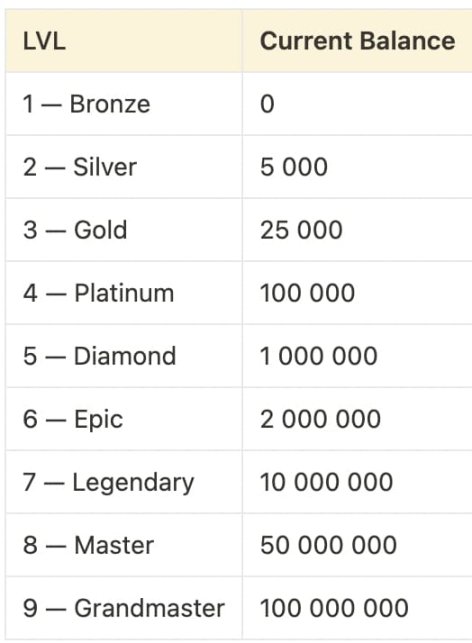 在 Hamster Kombat 游戏中,玩家的交易所等级取决于游戏积分余额,共有青铜、白银、黄金、白金、钻石、史诗级、传奇、大师、宗师 9 个等级。游戏小程序显示,还有大神(Lord)级别(10 亿积分以上)。