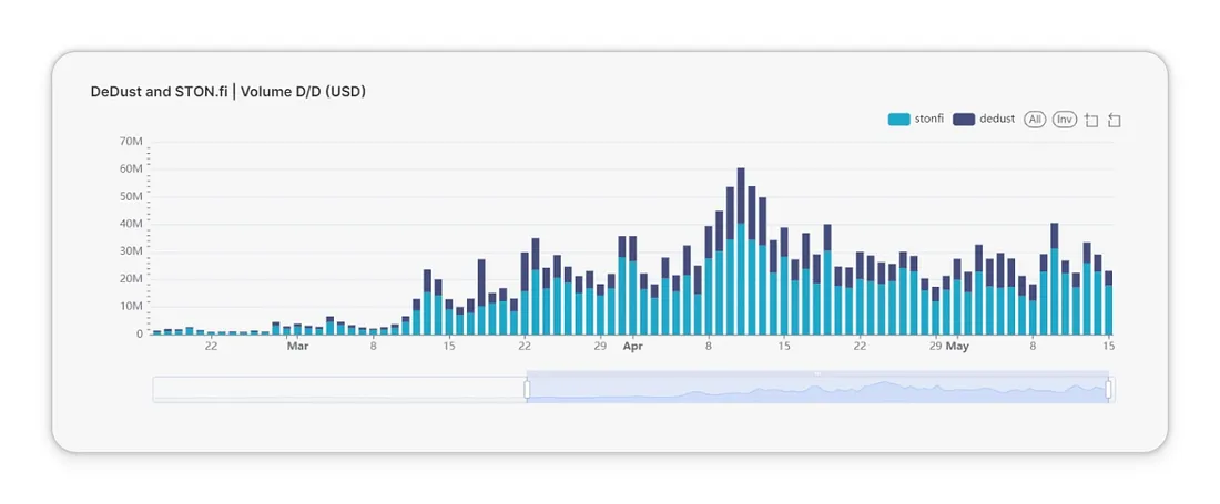 2024 年第一季度的主题之一是两个主要 DEXs 推出了 Telegram Mini Apps 。 DeDust 和 STON.fi 现在都有自己的迷你应用程序,这将使交易体验更加多样化,并允许用户直接在 Telegram 中执行交易。这对使用基于 Telegram 的代币研究工具和新闻频道的交易者来说可能特别方便。