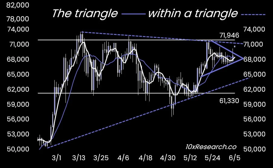 比特币当前已经突破了下图中的较小的三角形区间(紫色线),较大的三角形区间(紫色虚线)可能也将在 71500 美元左右被突破。如果美国就业率的下降或通胀率的降低可以使比特币的价格收盘在此线以上,我们将坚决地把目标价格设定在新高的位置,这可能会在本周五到下周三之间达成。因此我们预计到下周末,比特币将创出新的历史高点(超过 73500 美元)。