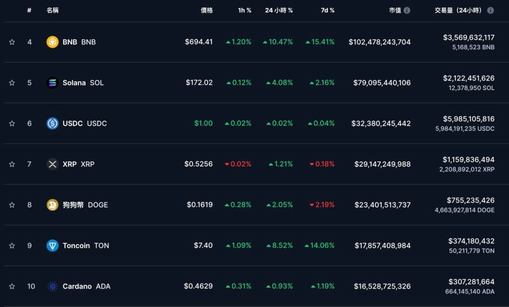 CoinMarkeCap 数据 显示 ,其他前十大代币近 24 小时也全数拉涨,其中 BNB 突破 690 美元,上涨 10.47% 表现最为强势、次高的则是 TON 有 8.5% 的涨幅。