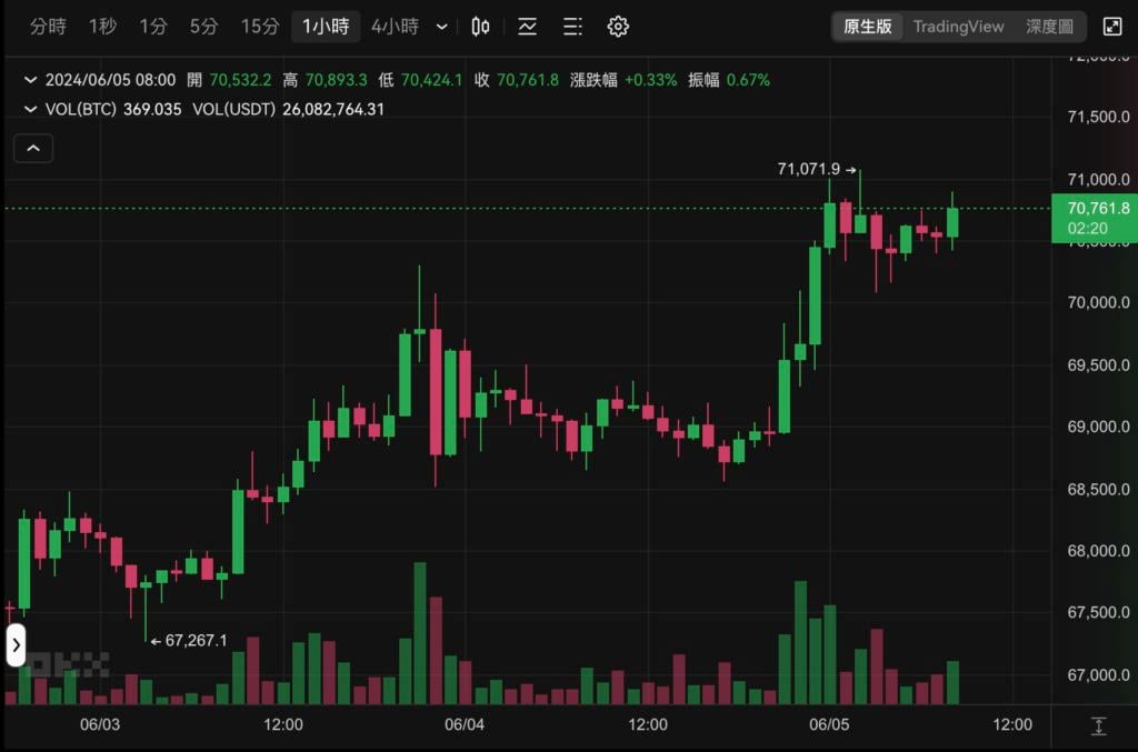 撰稿当下略有下滑报 70,761 美元、近 24 小时小幅上涨 2.62%,是否能再创新高,市场持续关注。