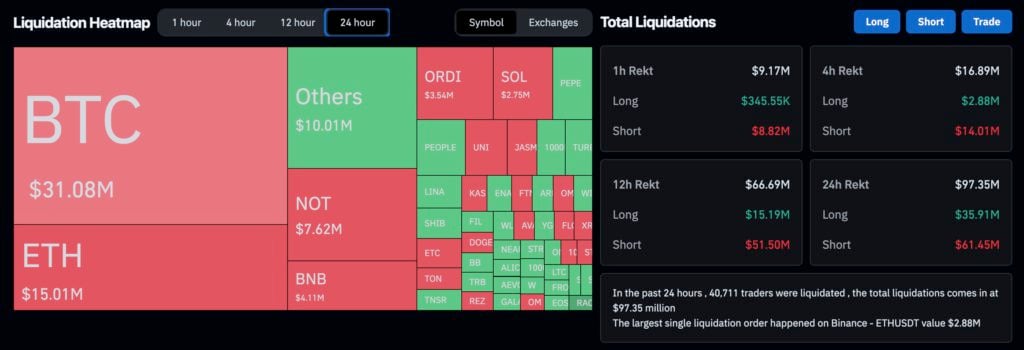 比特币拉涨的行情下,据 Coinglass 数据 显示,过去 24 小时,加密货币全网爆仓金额超过 9700 万美元(空头占 6100 万美元居多),约有超 4 万人遭清算。