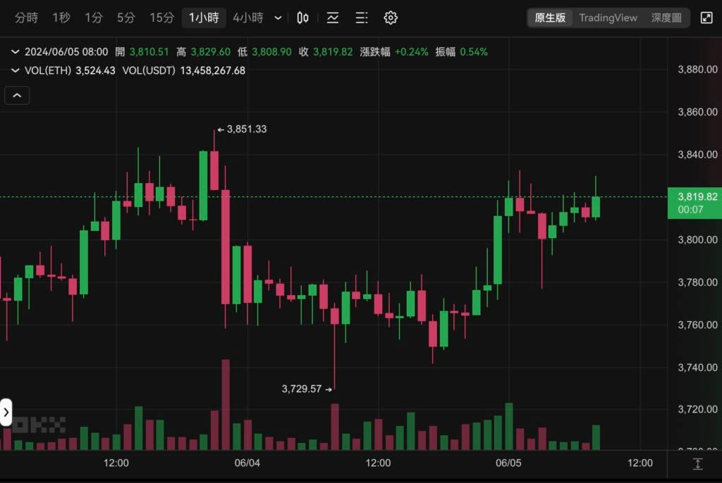 以太坊部分,虽然也是呈现上涨,但比起 BTC 来说相对没那麽强势。撰稿当下报 3,819 美元,近 24 小时上涨 1.49%。整体来说投资者似乎还是在观察 SEC 何时会正式批准以太坊现货 ETF 上市。