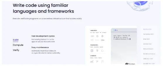 因此说白了,AI 云计算市场的下半场发展,亟需一整套面向 Web3 的区块链开发工具集,从而提供满足去中心化、可验证、低延迟、低成本的综合解决方案,从这个角度看,去中心化可验证云计算服务的必要性也逐步浮出水面,正好卡住了这个细分方向的空档: