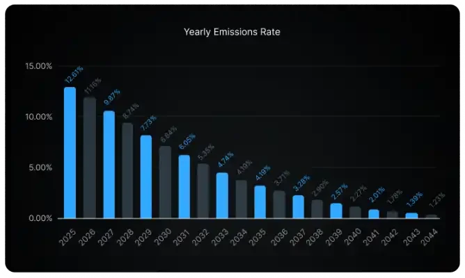 初始时,将发放 3 亿枚 $IO 代币。剩余的 5 亿枚代币将作为奖励发放给供应者及其股东,这一过程预计将持续 20 年。奖励按小时释放,并遵循一种递减模型(从第一年的 8% 开始,每月减少 1.02% ,约每年减少 12% ),直至达到 8 亿枚的总发行量上限。