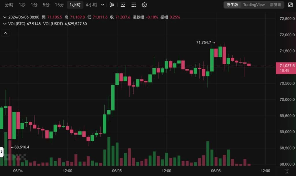 比 特币在昨(5)日突破 7.1 万美元之后,持续在高点震盪。并在今(6)日午夜零点左右最高触及 71,754 美元,不过随后卖压涌现,撰稿当下略有下滑报 71,037 美元、近 24 小时小幅上涨 0.41%,后续走向市场持续关注。