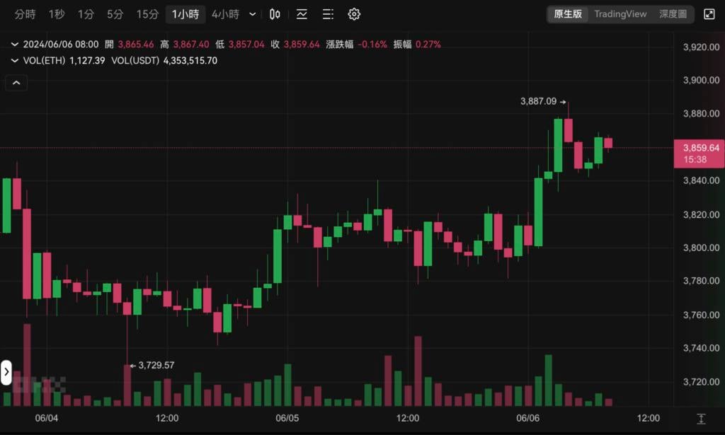 以太坊部分,波动又更高一些。撰稿当下报 3,859 美元,近 24 小时上涨 1.04%。