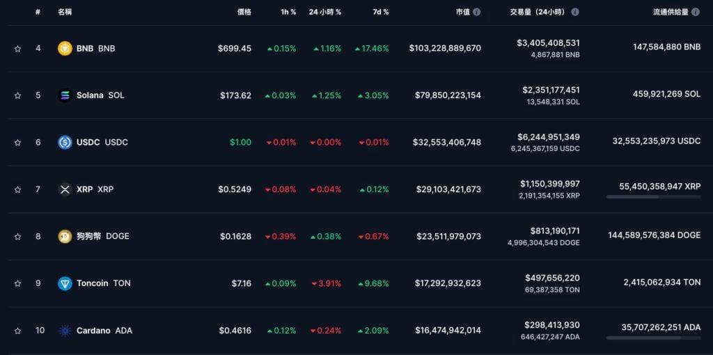 CoinMarkeCap 数据 显示 ,其他前十大代币近 24 小时涨跌不一:BNB 回落至 699 美元,涨幅缩窄至 1.16%;跌幅最大的是 TON,下跌 3.91% 现报 7.16 美元。