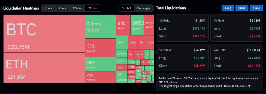 比特币窄幅震盪的行情下,据 Coinglass 数据 显示,过去 24 小时,加密货币全网爆仓金额超过 1.12 亿美元(空头占 6700 万美元居多),约有近 4 万人遭清算。