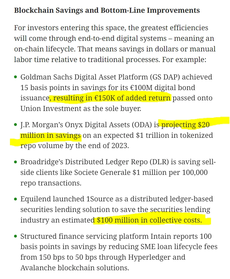 代币化解锁了一些重要功能,包括 24/7 转账和结算、可组合性,也对大多数金融机构的中后台、对账等传统基础设施进行了重大升级。 摩根大通预计通过代币化其回购量可节省 2000 万美元以上。区块链成为 21 世纪的现代资产账本。