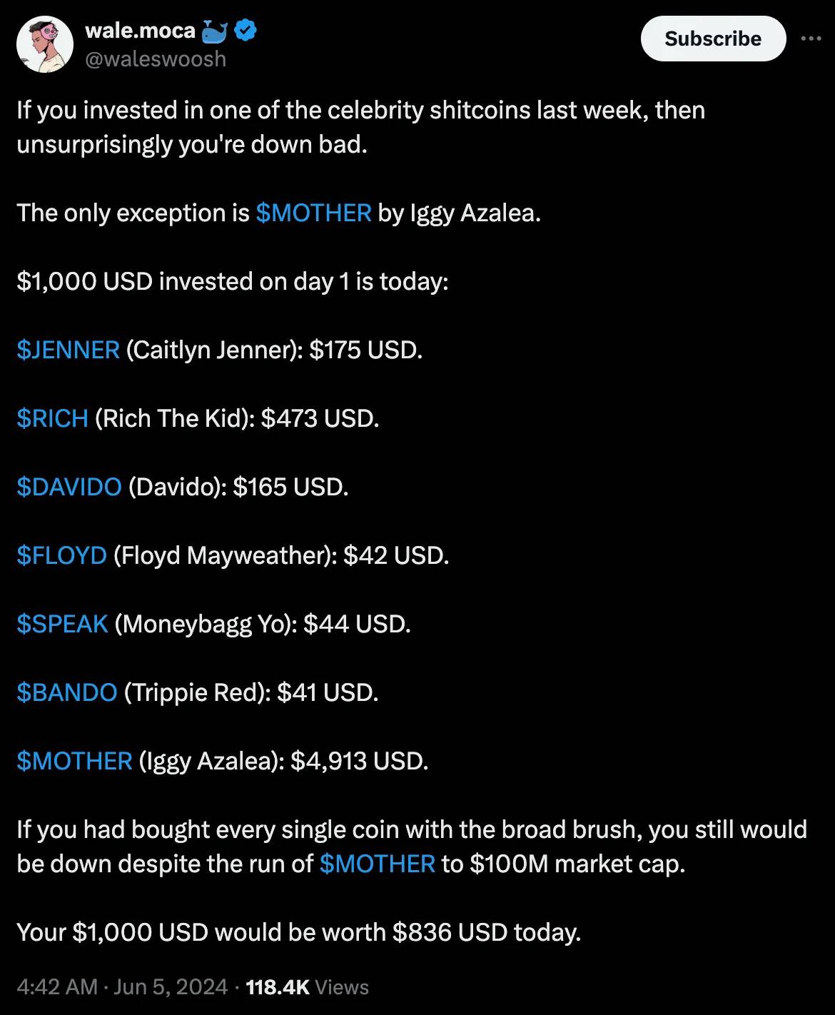 Iggy 和 MOTHER 能否打破名人币的趋势?现在才过了 10 天,时间会告诉我们答案。