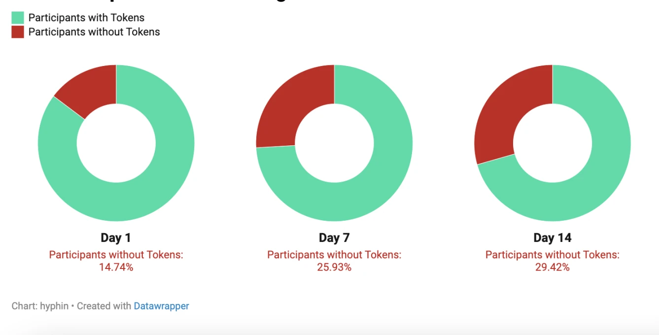 在平均情况下,所有 LBP 参与者中,近 15% 在第一天退出了全部头寸;而到第 14 天,这一比例达到 29.42% 。这是不可避免的,可以理解为第二波分配浪潮,以吸引后来者。