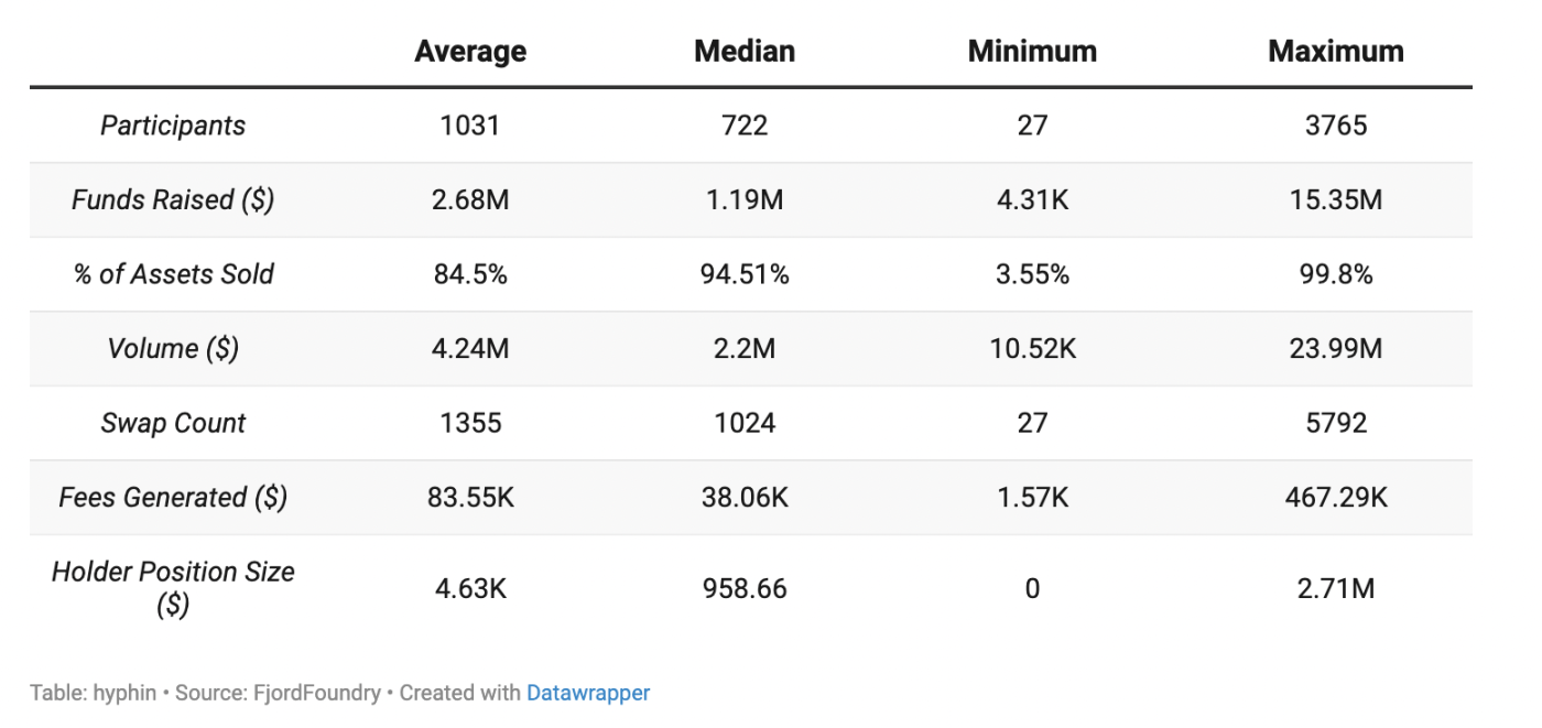 事实证明,代币发行通常为投机者提供有利可图的机会,让他们可以快速获利或以优惠价格获得长期头寸。要确定 LBP 是否也是如此,可以使用 Fjord 上的最终资产价值作为参考,以去中心化交易所的交易活动来计算平均值和中位数表现。