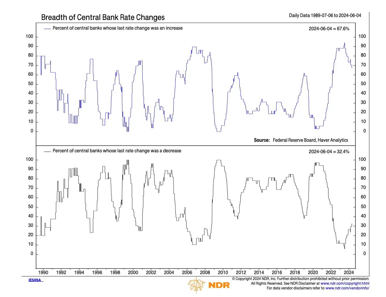 考虑到这张图,一个传统的央行行长不会在当前利率水平下降息。然而,本周,加拿大银行(BOC)和欧洲中央银行(ECB)在通胀高于目标时降息。这很奇怪。是否有某种金融动荡需要更便宜的钱?并没有。