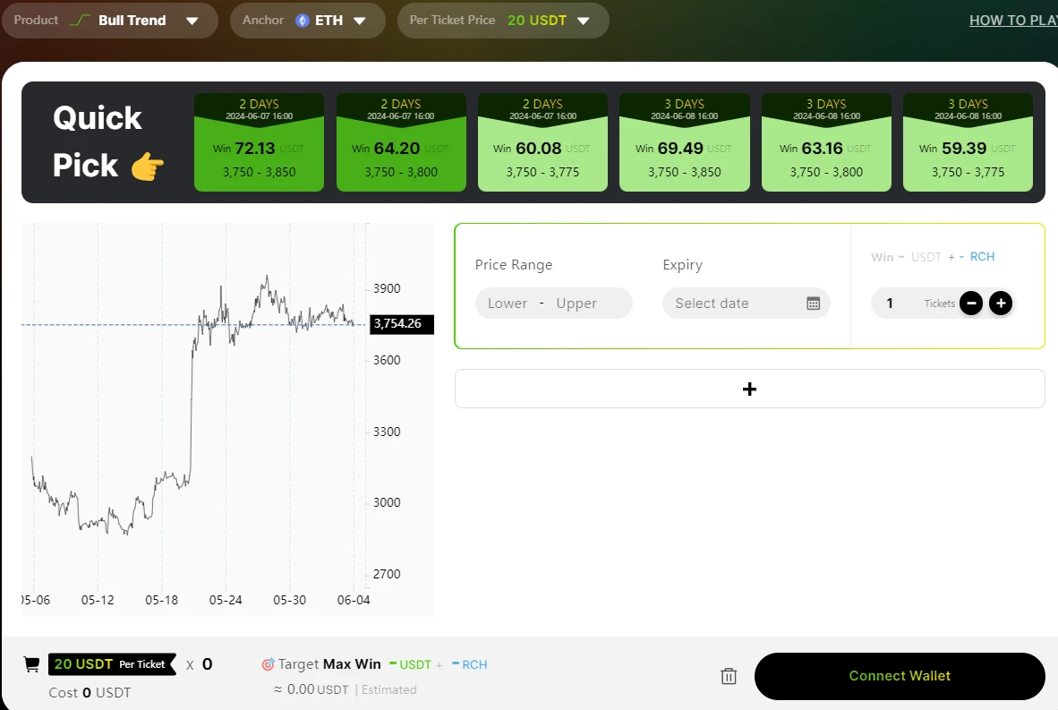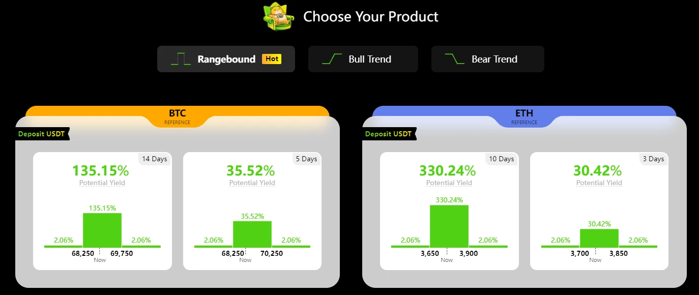 在 Earn 协议中,用户可选择区间(Rangebound)、看涨(Bull Trend)、看跌(Bear Treand)三种方向,当价格走势与用户预测方向一致时,用户将获得超额收益,即使超出范围也将有保底奖励(a guaranteed minimum yield)。