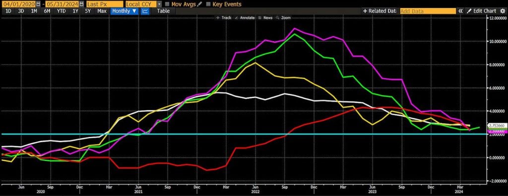 出于某种原因,我也不知道为什麽,七国集团央行的通膨目标都是 2%,而不考虑文化、增长、债务、人口等方面的差异。目前的通膨率是否正在迅速突破 2%?