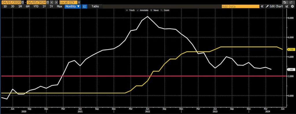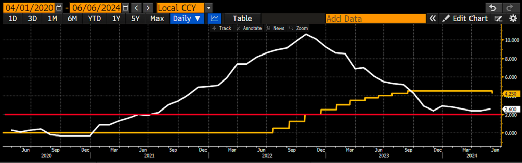 欧洲央行下调政策利率(黄色),而通膨(白色)高于目标(红色)。