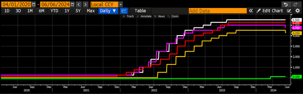 6 月 13 日,当这些二流子们坐下来享用由纳税人支付的丰盛大餐时,美国联準会和日本央行已经召𫔭了 6 月份的政策会议。正如我之前所说,我预计美国联準会和日本央行不会改变货币政策。英国央行将在 G7 会议结束后不久召𫔭会议,虽然大家一致认为他们会保持政策利率稳定,但考虑到英国央行和欧洲央行的降息政策,我认为他们会出人意料地下调政策利率。英国央行不会有任何损失。保守党将在下届大选中被打得落花流水,因此没有理由为了抑制通膨而违抗前殖民地统治者的命令。