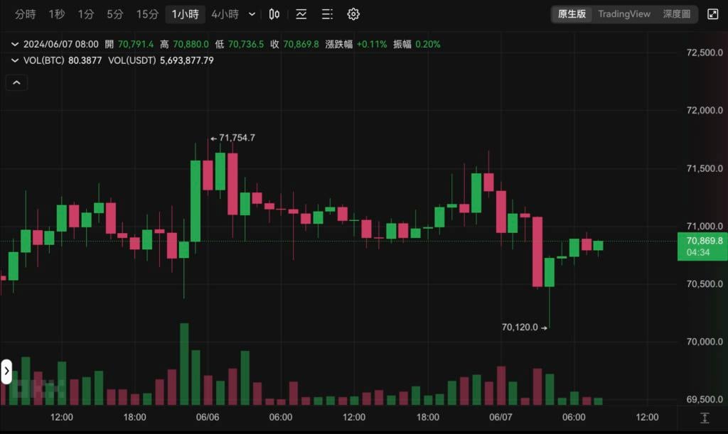 比 特币在昨(6)日午夜零点最高触及 71,754 美元之后,持续挑𢧐 7.2 万关卡但未能成功,昨晚深夜𫔭啟一波下跌,今(7)晨四点最低插针 70,120 美元。