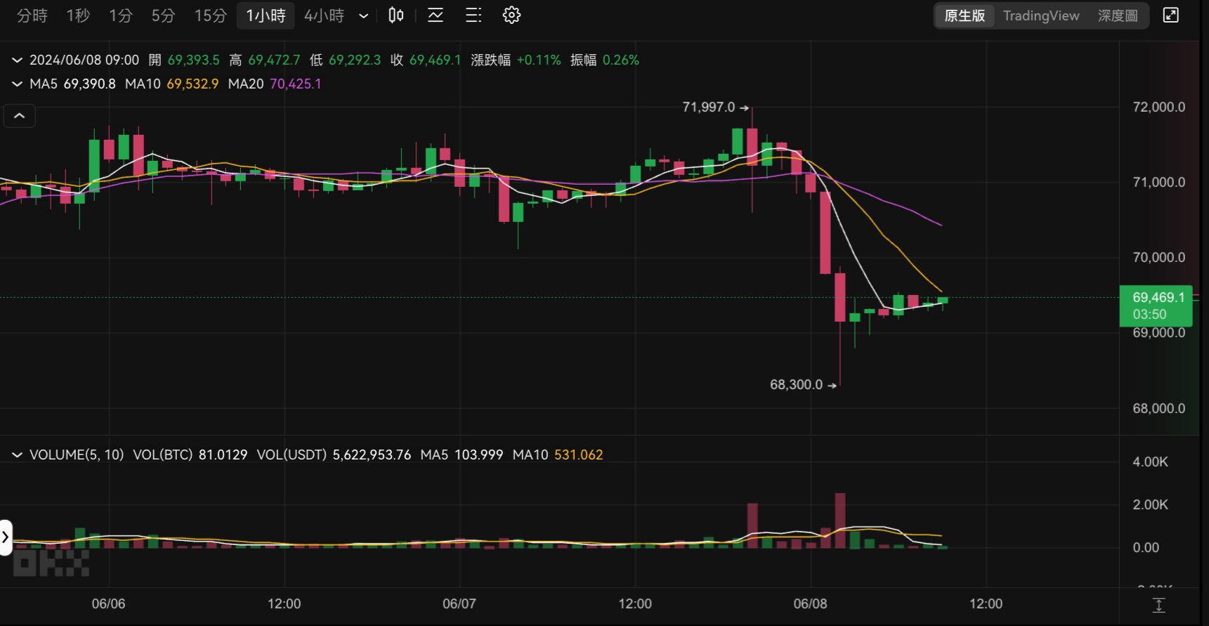 比特币昨晚也从 71,997 美元𫔭始一路震盪走低,午夜 2 点一度插针 68,300 美元,期间最大跌幅超 5%,撰稿当下略有回弹报 69,469 美元、近 24 小时下跌近 2 %。