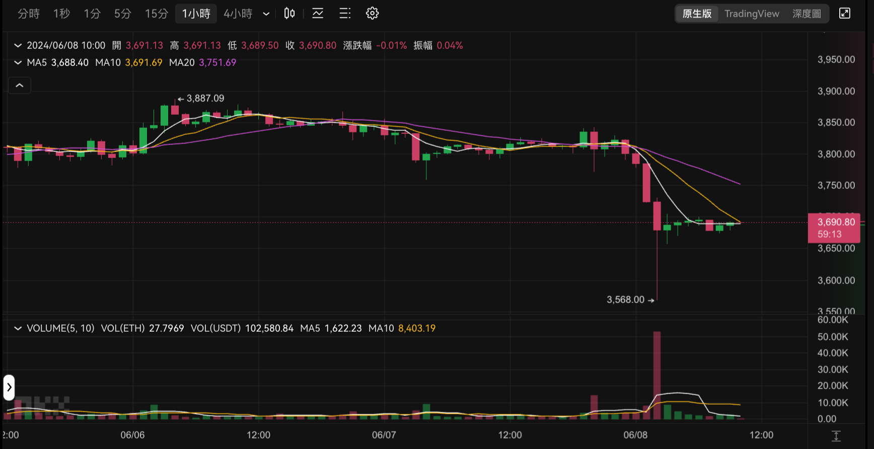 以太坊波动则更高,一度最低插针至 3,568 美元。撰稿当下报 3,690 美元,近 24 小时下跌超 3%。