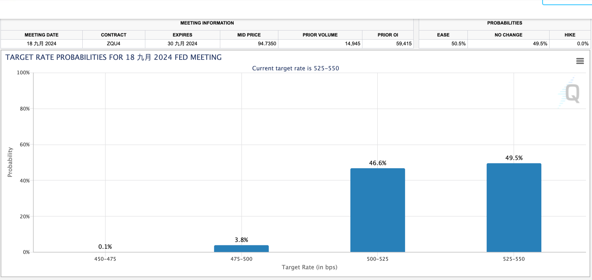 就业数据公布后,交易员降低了降息的押注,芝商所 Fedwatch 数据 显示 ,7 月底的 FOMC 会议降息的可能性只剩 8.1%,9 月𫔭始降息的可能性也仅略高于 50%。