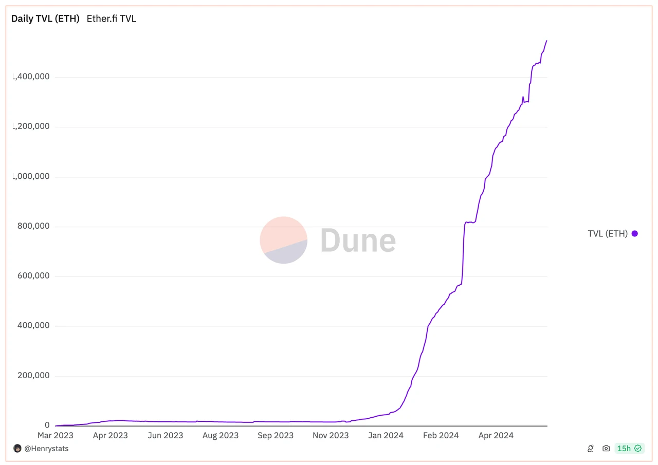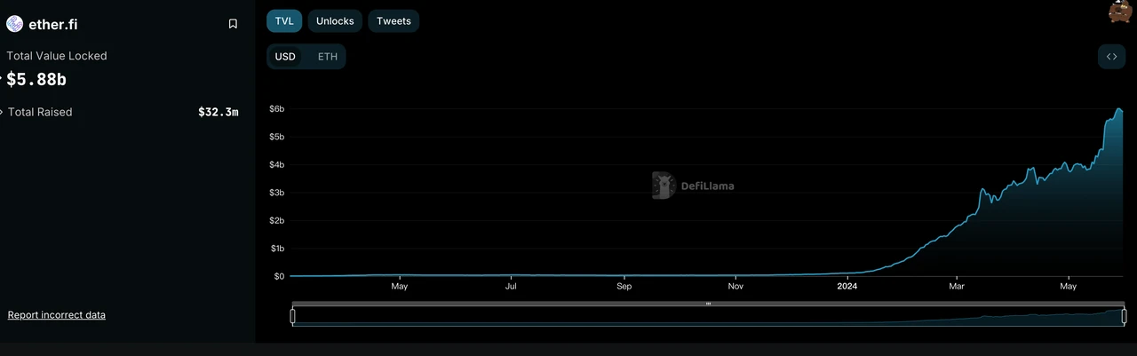 由图可以看出,ether.fi 的 TVL 已经达到了 58.8 亿美元,现在其 TVL 在 Restaking 赛道中排名第一。并且可以看出 ether.fi 的 TVL 从 2024 年开始一直保持着迅速上升的态势。
