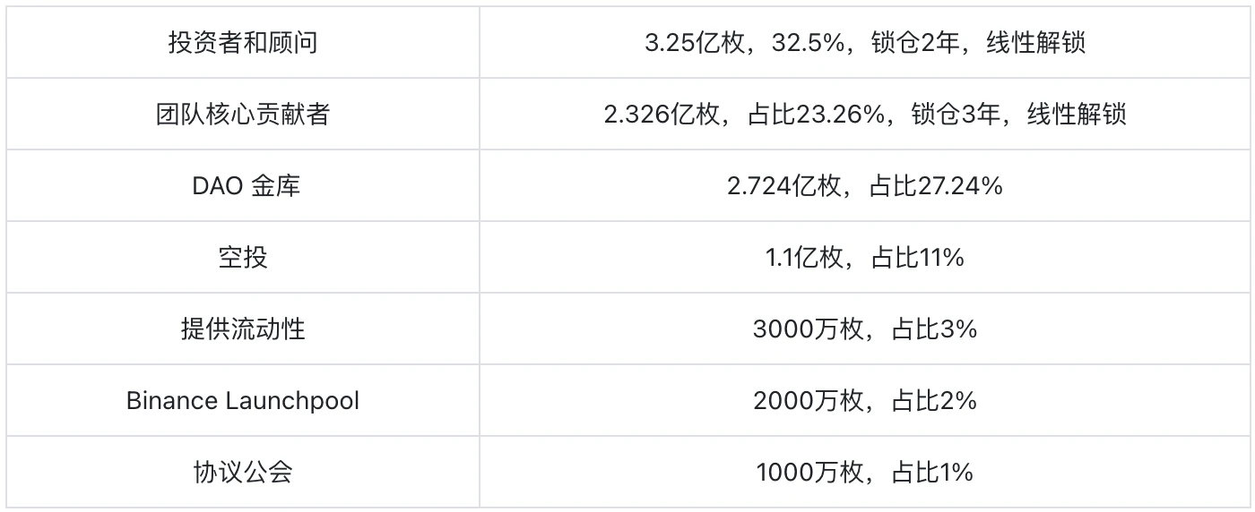 对 ETHFI 的赋能较少是 ether.fi 项目的一个显著缺点,在其设计中并没有加入质押机制,从而减少了对 ETHFI 代币锁定来增加项目价值这一个关键点。但是根据白皮书中对 ETHFI 的分配来看,代币影响市场最主要的部分是投资者和顾问、团队核心贡献者这两部分,这两部分分配的代币达到了总量的 55.76% ,虽然占比比较高,但是根据其锁仓时间来判断,需要在 2026 年 3 月之后才会将大部分代币释放,所以暂时不会影响到代币的流通率。