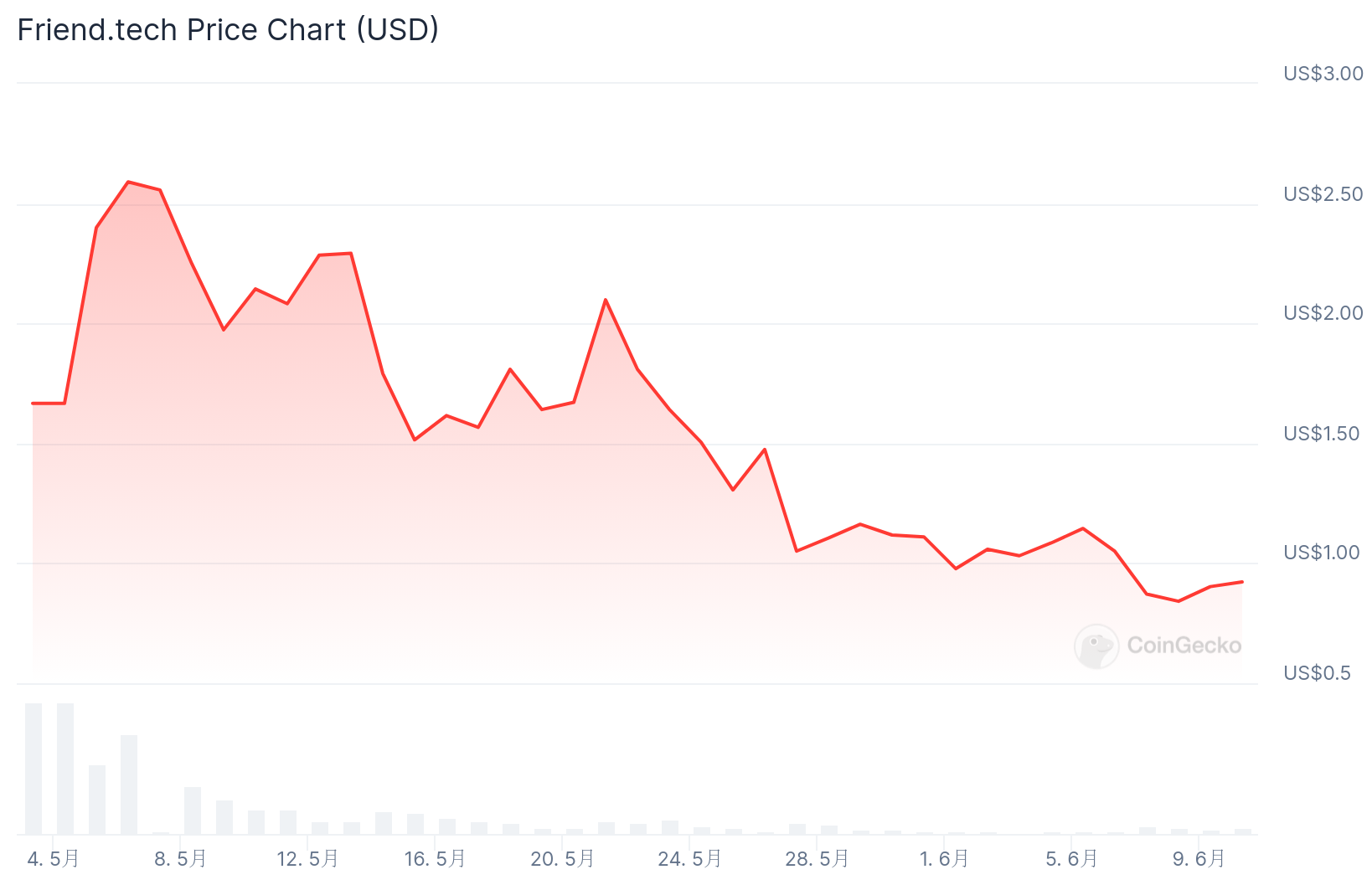 Friend.tech 在 5 月 3 日正式 𫔭放 代币 FRIEND 空投申领,并在 5 月 4 日 上缐 V2 版本,不过 FRIEND 自上缐后,币价不断直直落,据 CoinGecko 数据 显示,FRIEND 目前报 0.92 美元,较 5 月 3 日时一度 冲上 169 美元,跌幅超过 99%,且近 1 个月跌幅高达 56.6%。