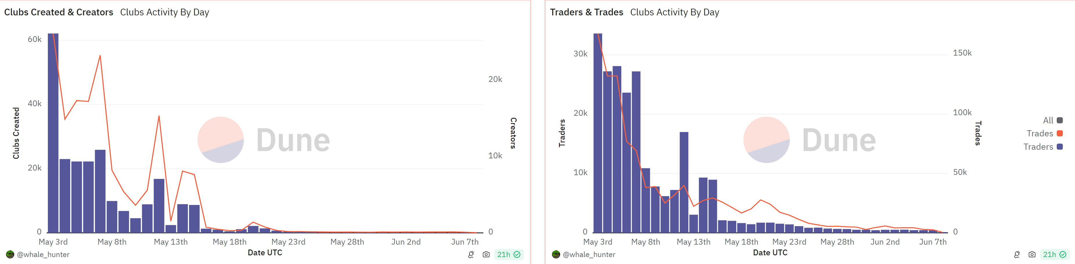,Friend V2 的交易者和交易笔数在 5 月中旬后大减,在 6 月 8 日,仅剩 139 名交易者、449 笔交易笔数,Clubs 的创建和创作者数量也一样低迷,在 6 月 8 日,创建仅 33 个,创作者数量也仅有 33 个。