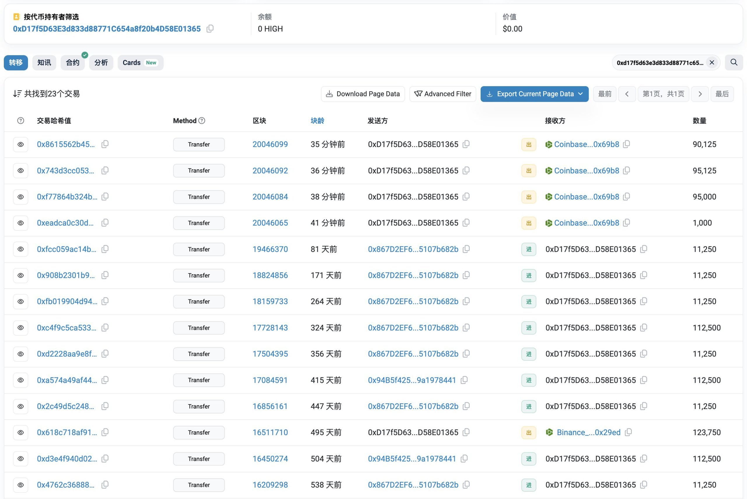 由于 HIGH 并未出现公𫔭利空消息,目前尚不知道为何价格会突然暴跌,但值得注意的是,疑似有巨鲸趁高点出货,据链上分析师馀烬 监测 ,一个 HIGH 投资者地址在昨日将 281,250 枚HIGH 转入 Coinbase ,价值 178 万美元,可能是準备获利卖出。