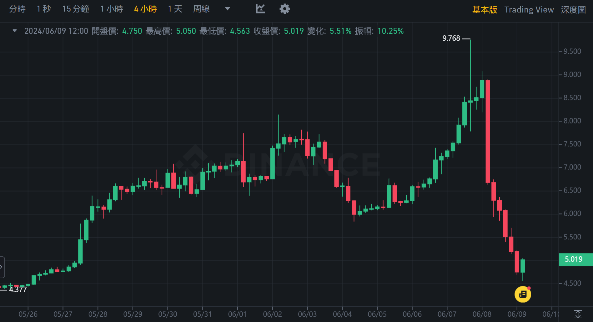 不过 HIGH 价格自 8 日中午 12 时起却突然崩跌,单日最深暴跌近 50% 至 4.56 美元,至截稿前,略为回升至 5.019 美元,近 24 小时跌幅仍高达 31%。