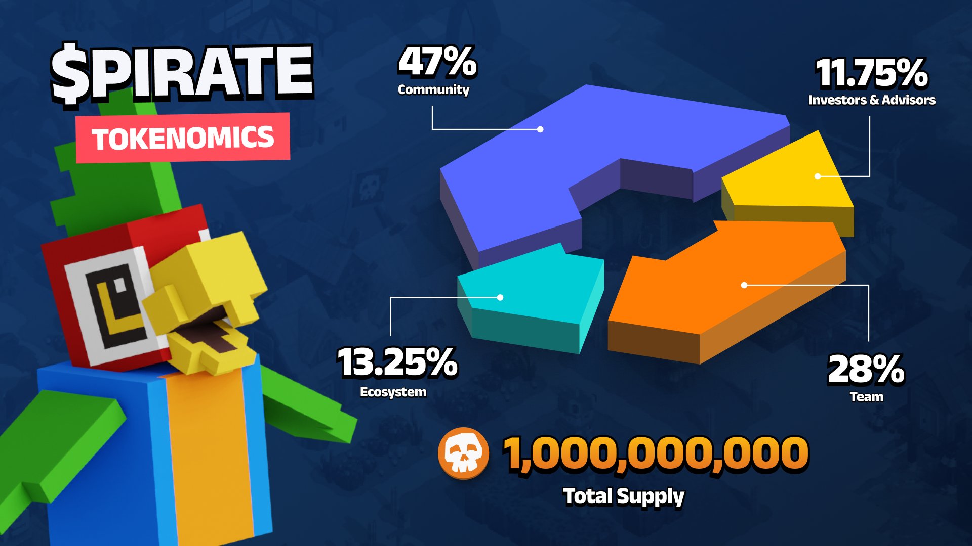 根据其代币经济学,PIRATE 总量 10 亿枚,其中社群分配 47%、团队分配 28%、生态系分配 13.25%、投资人与顾问分配 11.75%。
