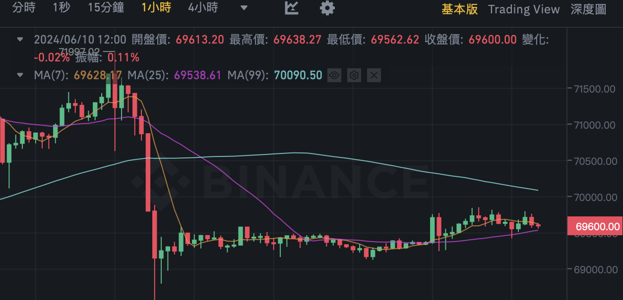 比特币在经历两天时光,从 6.9 万美元水準止跌震盪,现报 69,600 美元。