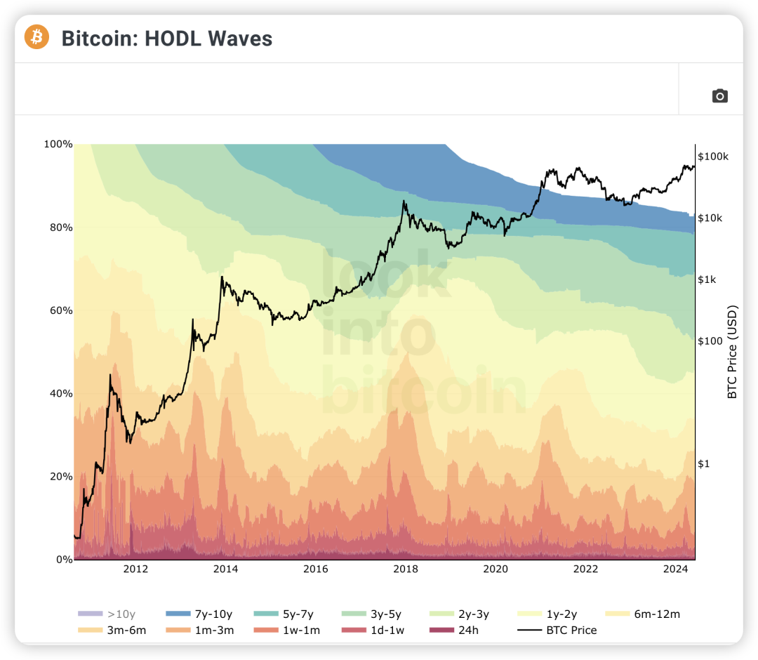 第二个指标是 HODL Waves,用来判断比特币持有人的分层,它分成持有比特币在一个月以下的用户(短期用户),和持有比特币在 1 年到 3 年中的用户的(长期用户)。在比特币疯狂下跌 70% 的过程中,短期用户疯狂割肉,从数据上来看这种用户占比会剧烈减少,当它减少到一个特别低的水平,说明短期用户全都被洗出这个市场,侧面证明比特币见底了。而当长期用户的占比剧烈地减少,说明“老韭菜”全在出逃,获利砸盘,而短期用户疯狂进入,它的占比疯狂提高,那这个时候肯定就是行情顶部了。