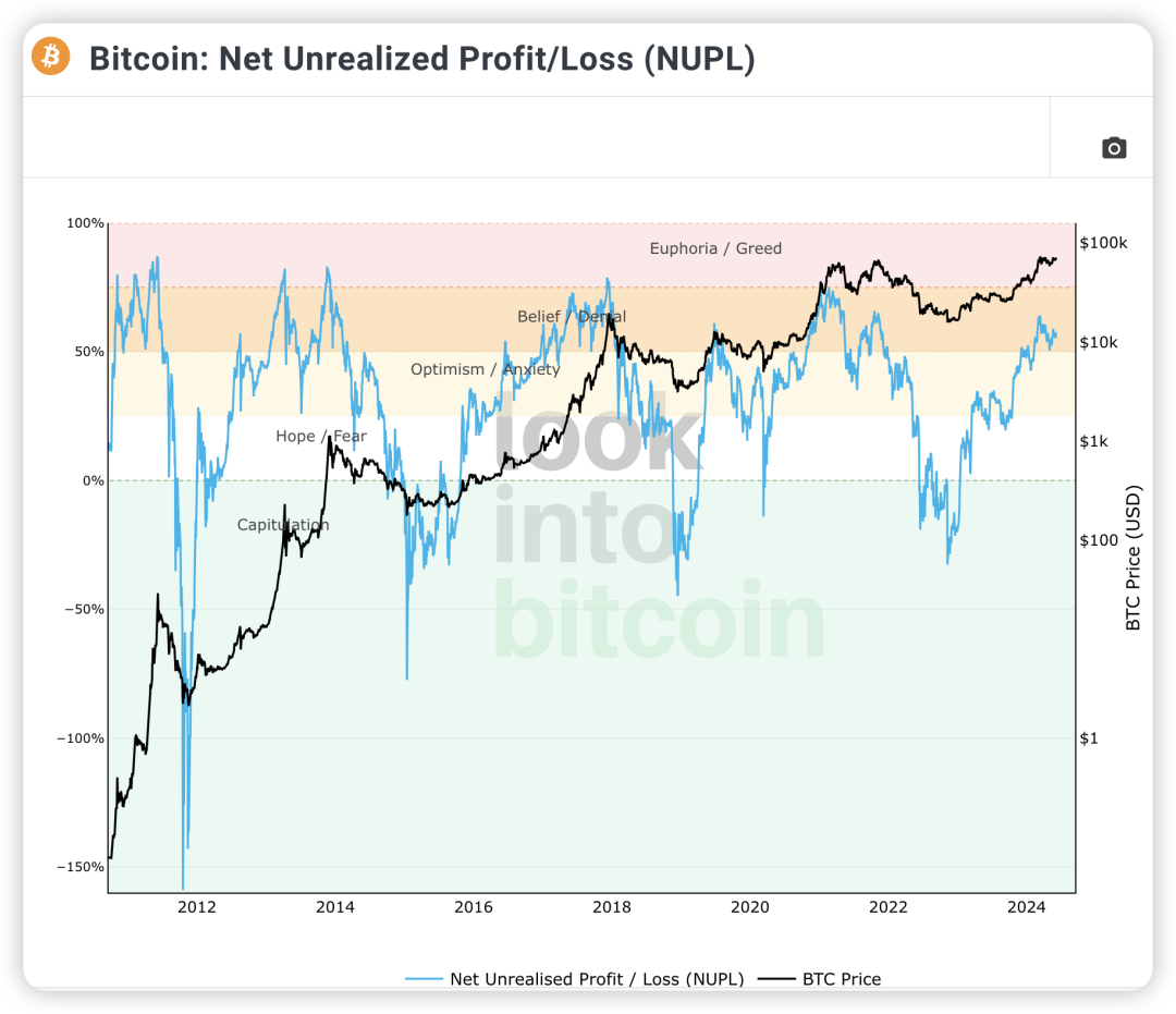 第一个叫 NUPL,就是衡量比特币链上大家的亏损 / 获利水平的,它呈现了一种红橙黄绿青蓝紫的一个彩虹图的状态。每次变成那个深红色的时候,就说明所有买比特币的人都亏钱了,当亏钱亏到一个极致的时候,大家就频繁割肉,筹码就会被接走,这个时候就证明是市场的低点,买进去没关系。它变成蓝色代表什么?就是世界上所有炒币的为人全都大额获利了,而且这个获利的浮盈水平特别的高。一旦获利盘出逃,市场就要崩盘,那么我判断市场获利盘进入到一个特别高的水平,市场情绪极度乐观,这时候就是周期的顶部,你就该逃了。