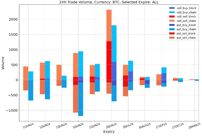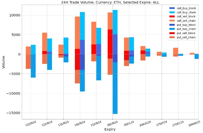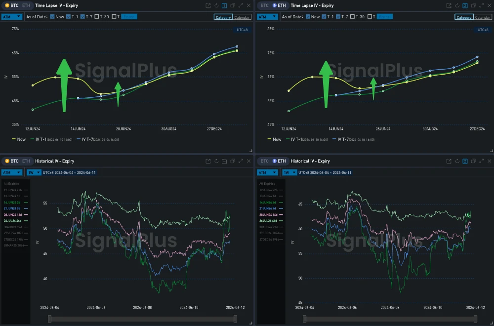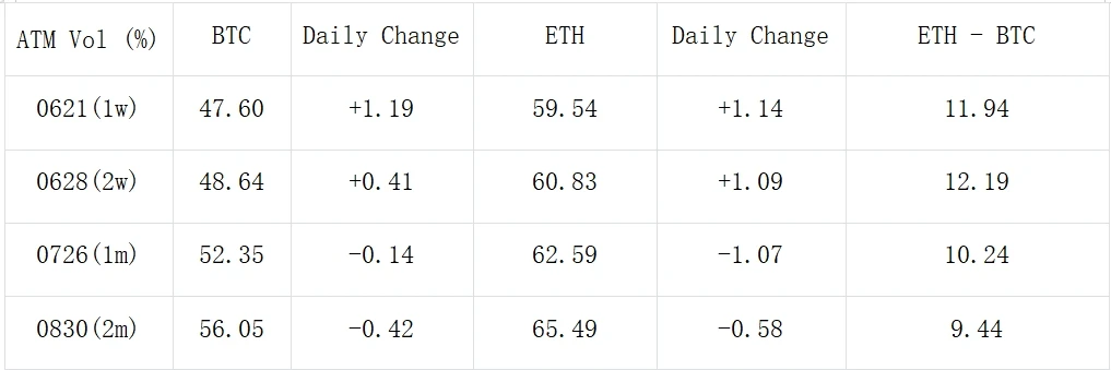 期权方面,前端 IV 在美国经济数据带来的不确定和比特币因遭到抛售而下跌的行情中大幅上涨,ETH 六月各期限出现大量看跌期权买入建仓,BTC 前端看跌买入的比例也同样被拉高,但与此同时在六月底上行权价为 70000 的看涨期权更是遭到大量抛售,共同造成了两币种前端 Vol Skew 的大幅同步下跌。