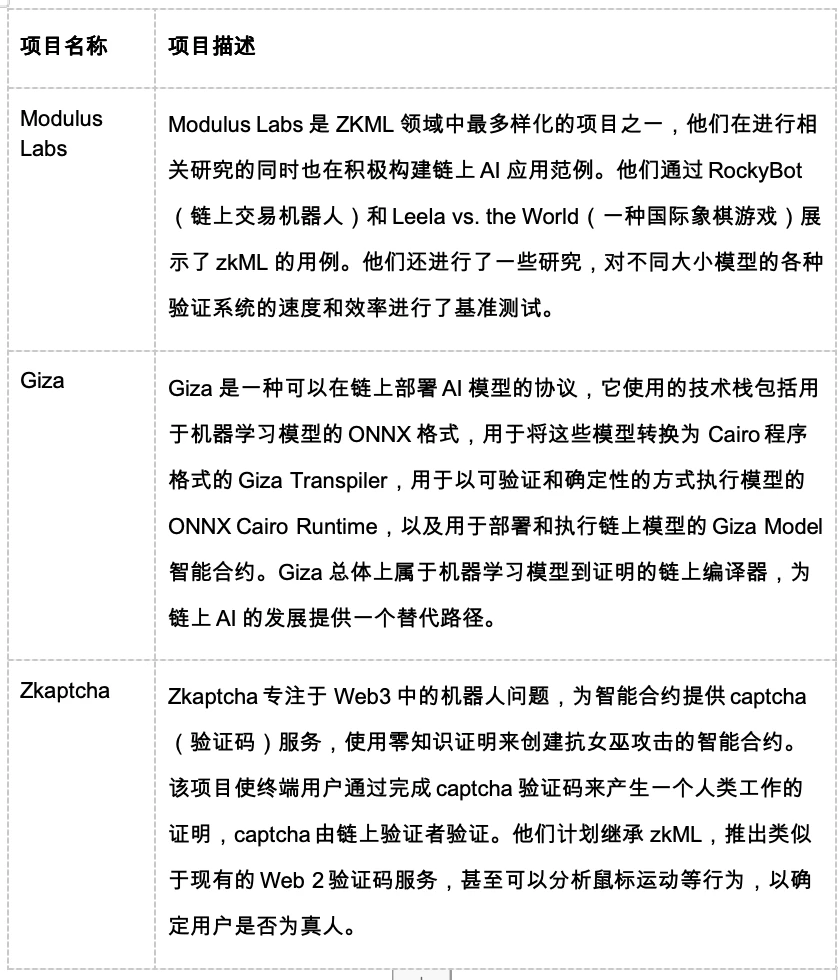 第一张表格是一些潜力 ZKML 项目简介. 第二张图为 ZKML 的一些其他项目.