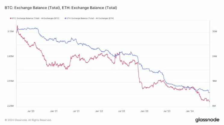 卖压将尽?比特币和以太坊在CEX馀额下滑至近四年新低