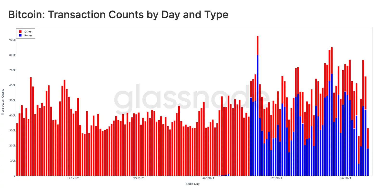 随着 Runes 协议在减半时(2024 年 4 月 20 日)推出,对 Runes 交易的需求飙升至每天 60 万至 80 万之间,此后一直保持高位。