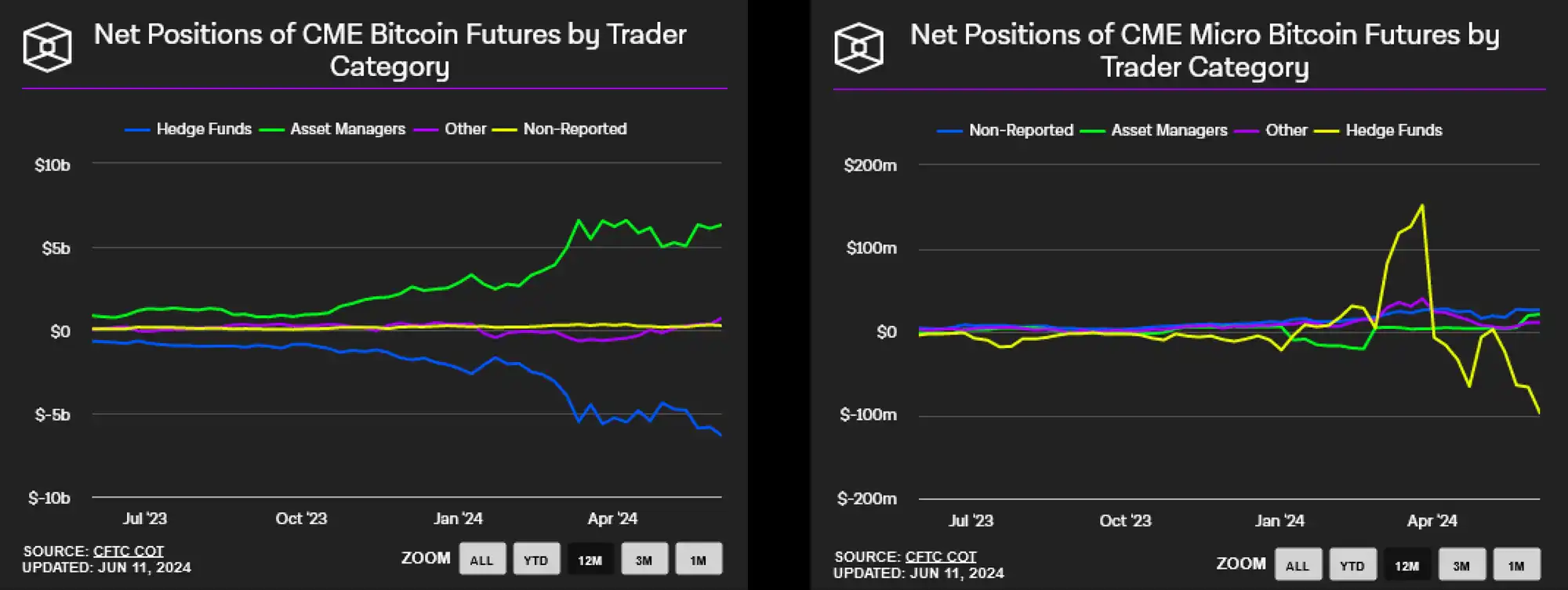 我们可以看到,被归类为对冲基金的实体正在建立越来越大的比特币净空头头寸。
